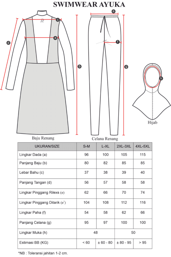 Terdiri dari 2 bagian: atasan (Jilbab menyatu dengan baju renang) dan bawahan (celana renang). Berbahan dasar Scuba berkualitas tinggi yang lembut, bersifat elastis, mudah kering dan sangat nyaman digunakan untuk aktivitas renang-mu.