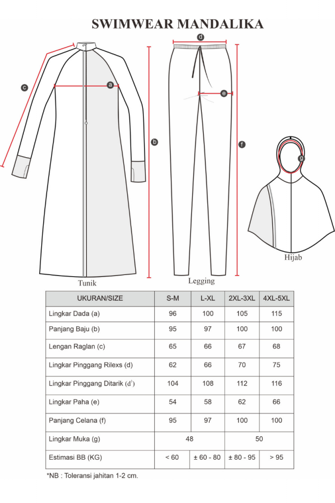 Swimwear Mandalika adalah Setelan renang Muslimah dengan design yang syar’i, dengan panjang Jilbab menutup bagian dada dan panjang Kaos hingga dibawah lutut, sehingga aman pada saat berenang. Terdiri dari 3 bagian: atasan (baju renang), bawahan (celana renang) dan sudah include dengan (Jilbab).