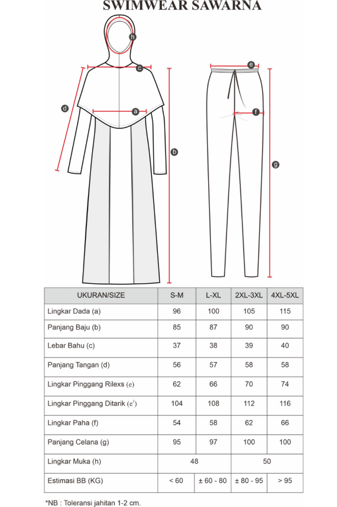 Swimwear Sawarna adalah Setelan renang Muslimah dengan design yang syar’i, dengan panjang Jilbab menutup bagian dada dan panjang baju renang hingga lutut, sehingga aman pada saat berenang. Pada bagian Jilbab di design menyatu dengan baju renang sehingga memperingkas pemakaian, disertai dengan pengait dibagian depan yang akan membuat Jilbab-mu tetap aman tidak akan terangkat saat berada didalam air.