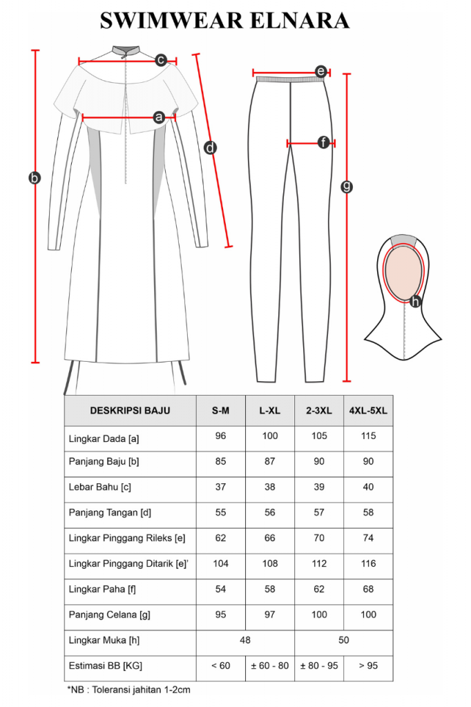 Swimwear Elnara adalah Setelan renang Muslimah dengan design simple dan feminim, dengan potongan sabrina yang menutup bagian dada, panjang Kaos aman hingga lutut dan disertai tali pengikat dibagian dalam sehingga aman pada saat berenang. Terdiri dari 3 bagian: Kaos, Celana Legging dan Hijab. Berbahan dasar Dry-co yang terdiri dari campuran polyester, spandex dan nilon yang memiliki sifat elastis, padat, mudah kering dan nyaman digunakan untuk aktivitas renang-mu. Memiliki variasi warna Maroon, Electric Blue, Black dan Grey